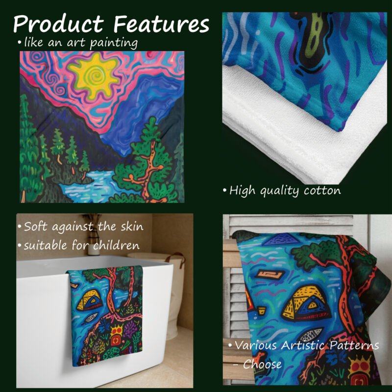 🎨Art Printing Patters,Extra Large Artistic Cotton Towel, Soft and Colorful, Suitable for Home Bathroom, Beach, Camping, Blanket and Art Hanging, ☀️ Dazzling Outdoor Accessories – Turn a family bath towel, camping, beach or outdoor day into an artistic display with an oversized custom cotton beach towel featuring a vibrant colorful print that looks almost like a digital photo. Make your travel plans more personalized and beautiful 🎨Perfect Art Cotton Towel Size–We offer extra large cotton towel sizes 72″x36″ and 60″x30″ for you to choose from, big enough to hug your body whether you’re going camping, at the beach or outdoors in the garden at night Indoors, this large towel doubles as a blanket 🎨🏄Soft Premium Cotton – USA Fabric Composition: 52% Cotton, 48% Polyester, USA Fabric Weight: 360 g/m2) Enjoy the softness and high absorbency of premium cotton towels 💧, our towels are made with comfortable softness, Quickly absorbent cotton terry cloth. 🏄lightweight and portable; 💧( There are slight differences in the cotton and polyester composition between different batches.) 🌴Love for art and nature: Our cotton towel art painting themes all come from the love for art, nature, plants and animals, advocating nature, collecting and processing nature’s art into art towels, making art extra large Cotton towels come into your life and accompany you on camping, beach, and camping… Of course: she can also be used as a blanket or hung on the wall as an art painting. ☀️Super multi-purpose, multi-site display: camping, camping, family gatherings, swimming pools, beaches… When used outdoors, it is like a walking art painting; multiple styles, multiple art forms to choose from. Abstraction, oil painting, watercolor, drawing, illustration, etc… animals, plants, flowers, leaves, stones… art is collected from everything in nature. 🌴Customized printing according to customer needs.