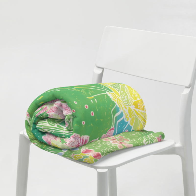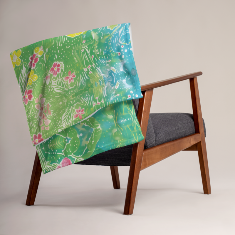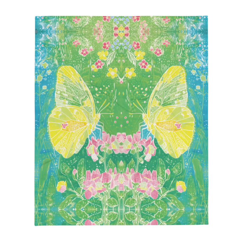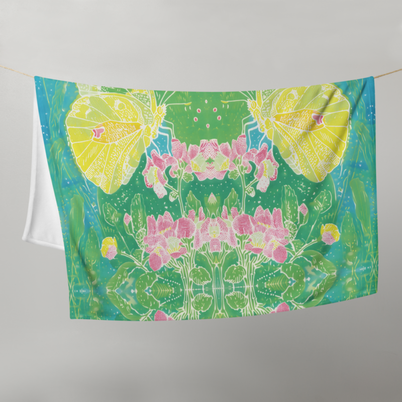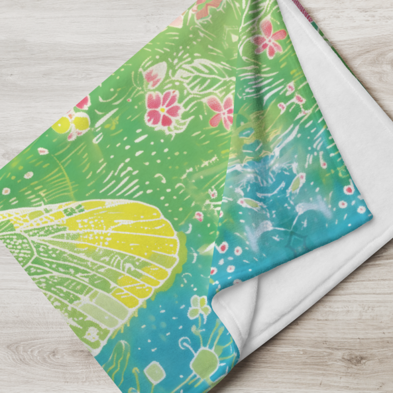 This blanket is absolutely stunning! The abstract flowers and butterfly design is so artsy and vibrant – looks like a painting.